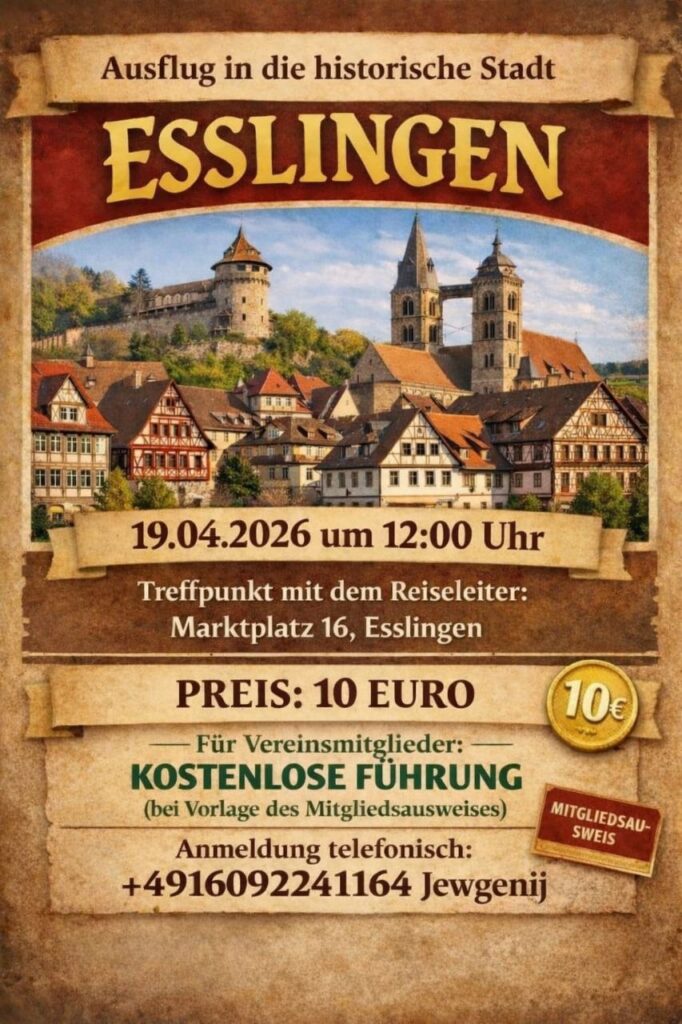 Am 19.04.2026 um 12.00 Uhr. Treffpunkt: Marktplatz 16, Esslingen. Anmeldung unter der Telefonnummer: +49 160 9224 1164